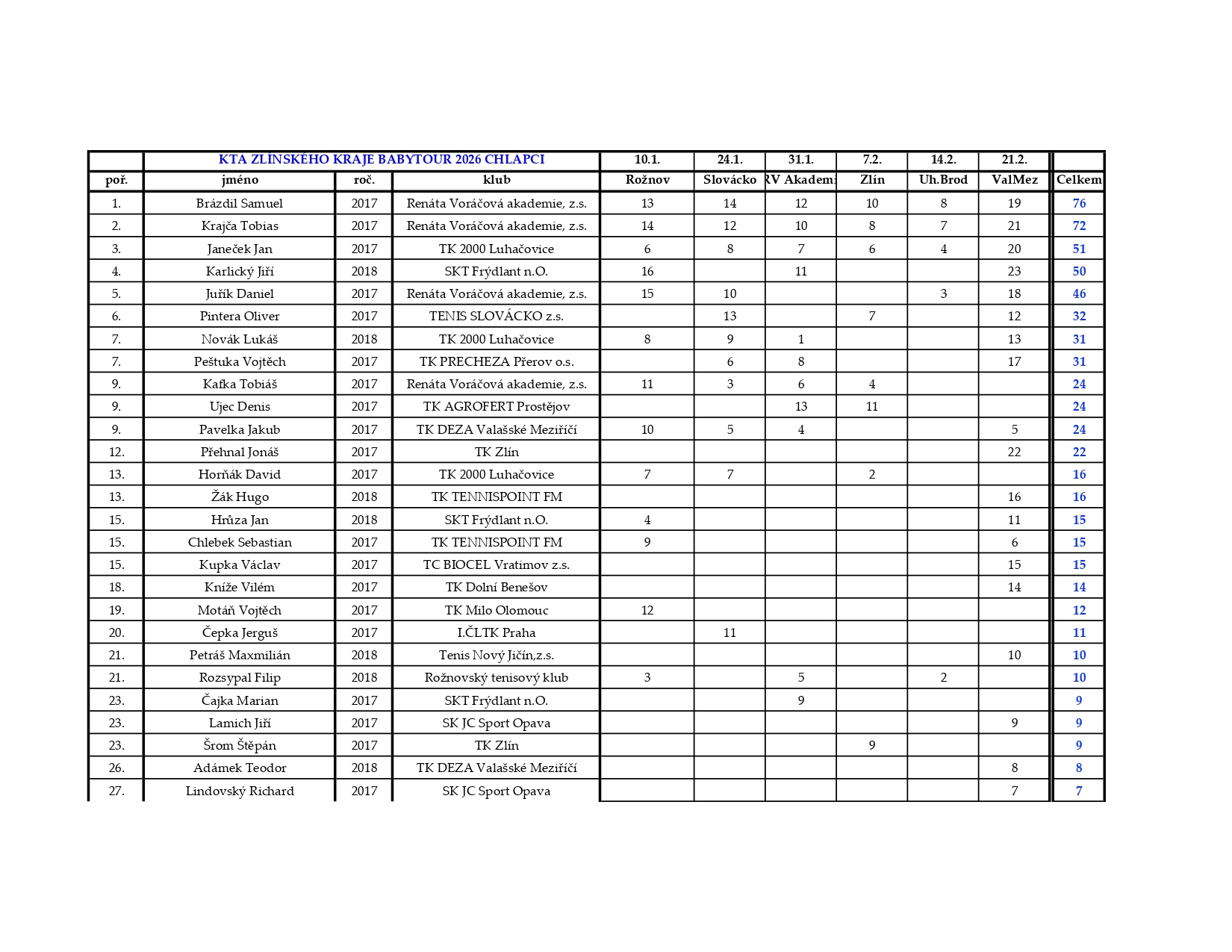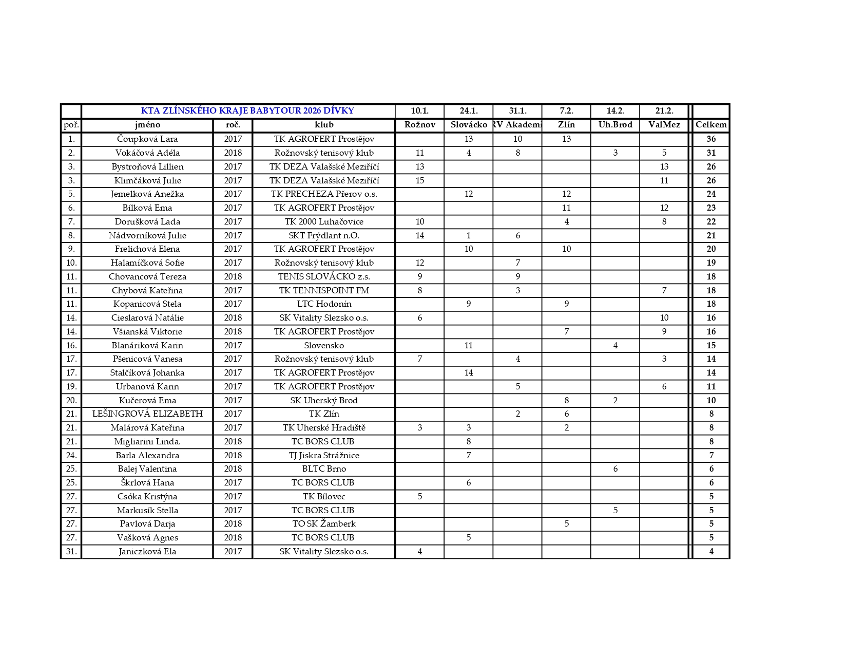 Pošesté a naposledy se sešli talentovaní hráči kategorie babytenis, kteří reprezentují Krajskou tenisovou akademii Zlínského kraje, aby se utkali v rámci seriálu Babytour 2026. Turnaj se konal v TK Deza Valašské Meziříčí a zúčastnilo se ho 13 dívek a 23 chlapců.